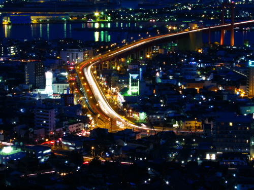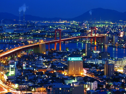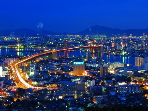 | 北九州市若松区の中心街から車で約15分で到着する高塔山公園からは若松区と戸畑区を結ぶ若戸大橋を中心とした夜景を見ることができます。皿倉山ほどの高度はないものの、夜景の規模はなかなかで、展望台もきちんと整備されていて雰囲気もいいスポットです。 |