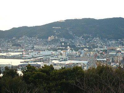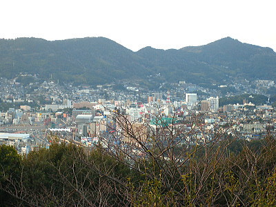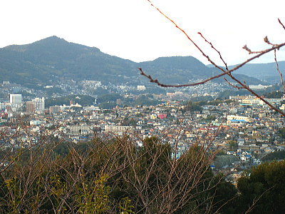 | 天神山は佐世保市の中心街から南東の方角にある小高い山 で、山頂は公園になっています。ここからの眺めは佐世保市を 南側から北の方向に向かっての眺めになります。 (弓張岳と反対側からの眺め) 木が視界を少々遮りますが、在日米海軍佐世保基地・佐世保 港・佐世保市街地と一望できます。 |