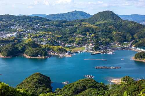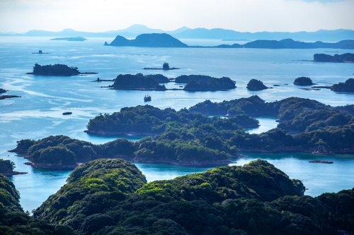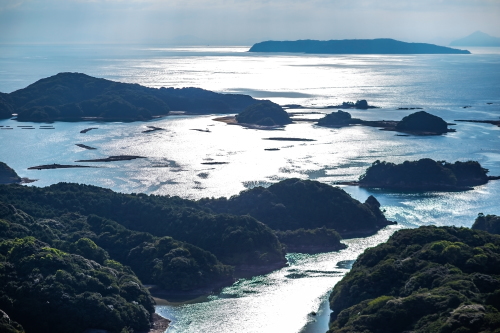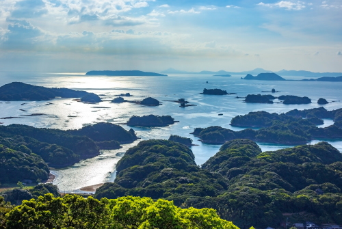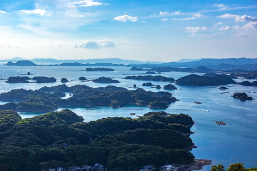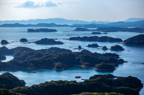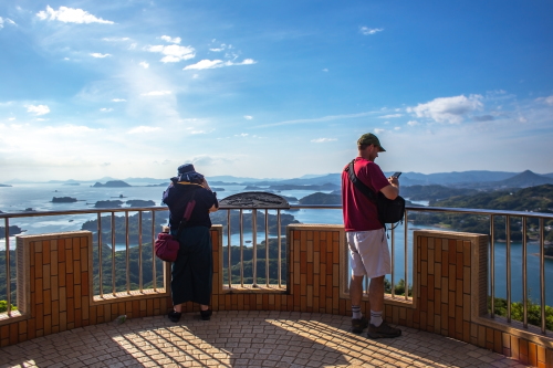 | 佐世保市内から南西の方向に車で約30分のところに南九十九島を展望できる展望台・展海峰があります。展海峰付近は西海国立公園に指定されており、美しい南九十九島を一望できる展望台があり多くの観光客が訪れます。駐車場は広く、駐車場には売店もあります。 |