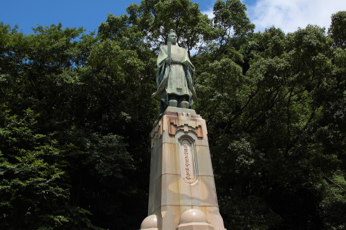 本殿東側にそびえ立つ島津斉彬像。