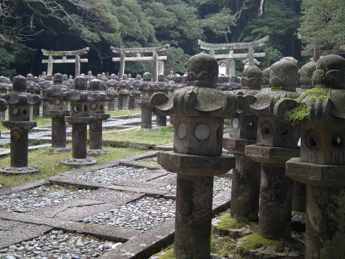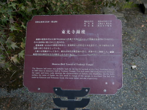 | 東光寺は萩藩藩主・毛利家の歴代の奇数の藩主の墓があるお寺です。1691年に3代萩藩藩主である毛利吉就によって建立された広壮な寺で、吉就の死後は毛利家の菩薩寺になりました。総門・鐘楼・大雄宝殿・山門の4つは国の重要文化財に指定されています。 大雄宝殿裏にある萩藩主毛利家墓所には500基もの灯篭があり、8月15日には全ての灯篭に明かりが灯されます。 |