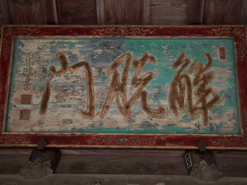 | 東光寺三門に掲げられている「解脱門」の額。 |