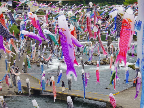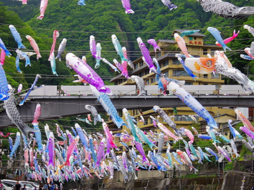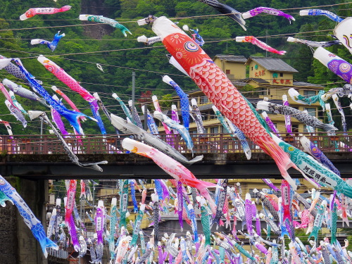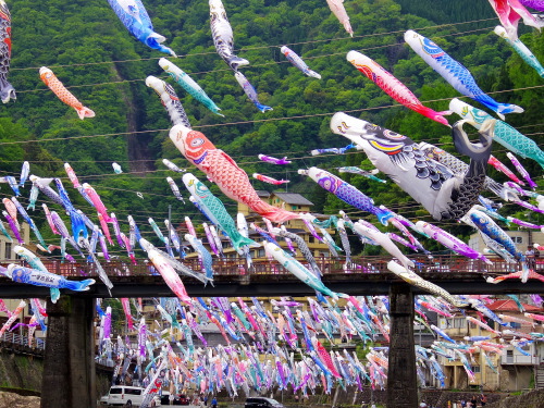 | 熊本県と大分県の県境にある杖立温泉のこいのぼり祭りには、毎年4月から5月の連休過ぎまで行われ、筑後川(大山川)を跨って約3500匹のこいのぼりが風に乗っていきおいよく泳いでいます。祭り当日は、地元で取れたヤマメや鳥の串焼きなどが販売され、多くの観光客が訪れます。 |