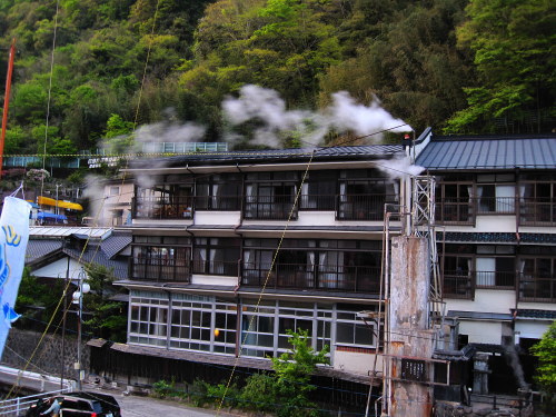 | 杖立温泉の旅館。あちらこちらから湯煙が上がっています。 |