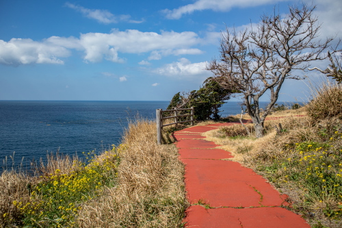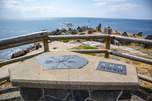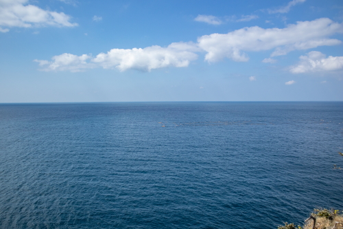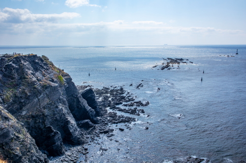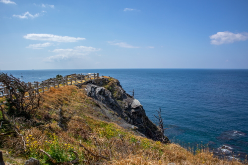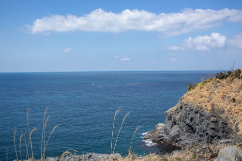対馬市の南西端にある豆酘崎は、対馬海峡と朝鮮海峡を眺める事ができる絶景ポイントで遊歩道が整備されています。断崖絶壁で視界は約270度の視界で水平線が広がり、水平線から朝日が登り夕日が水平線に沈んで行くのを見る事ができる展望地です。よく見ると水平線がやや丸みを帯びていて、地球が丸いのを実感できるポイントでもあります。