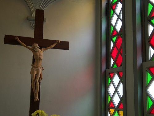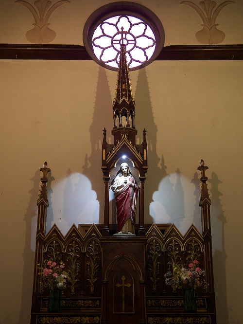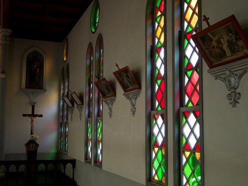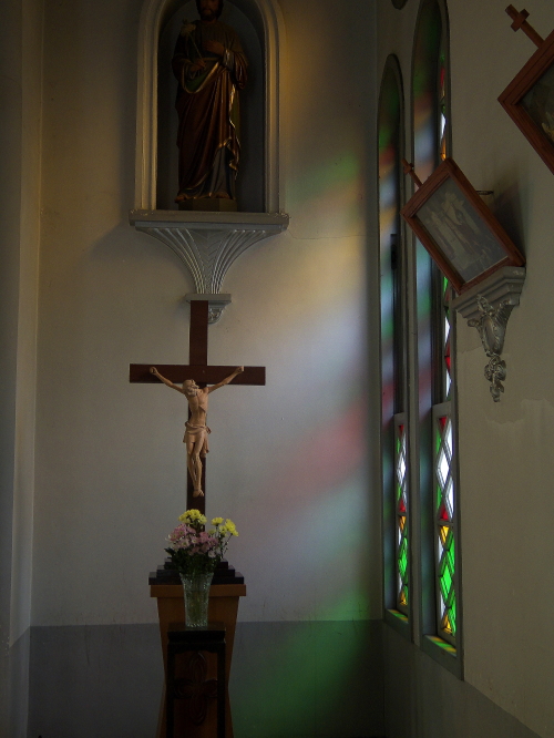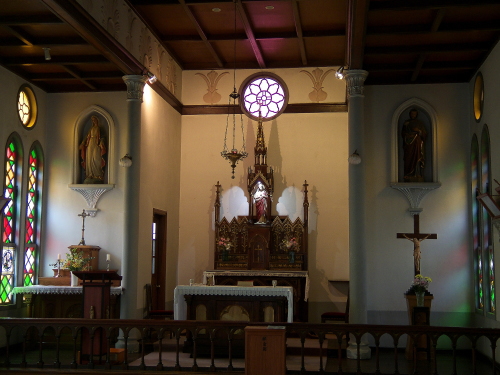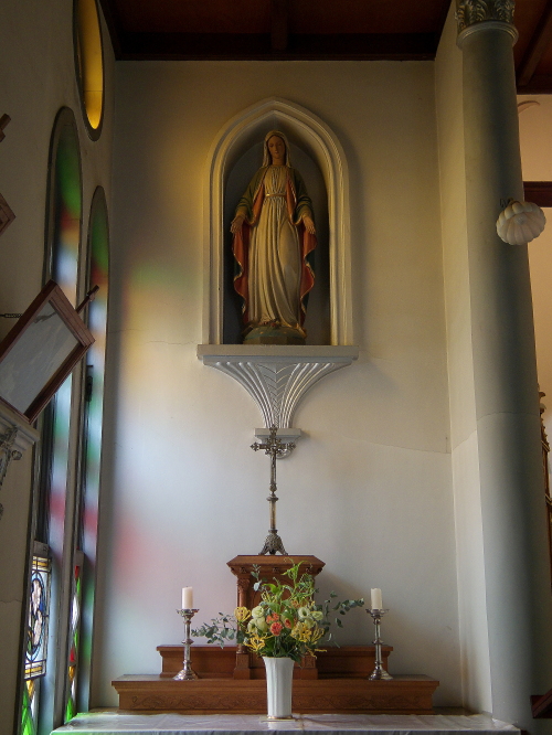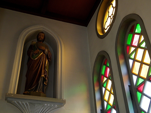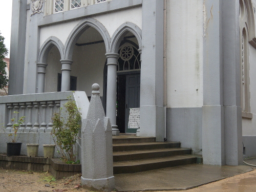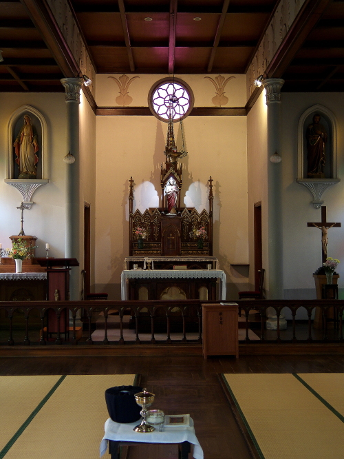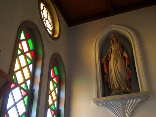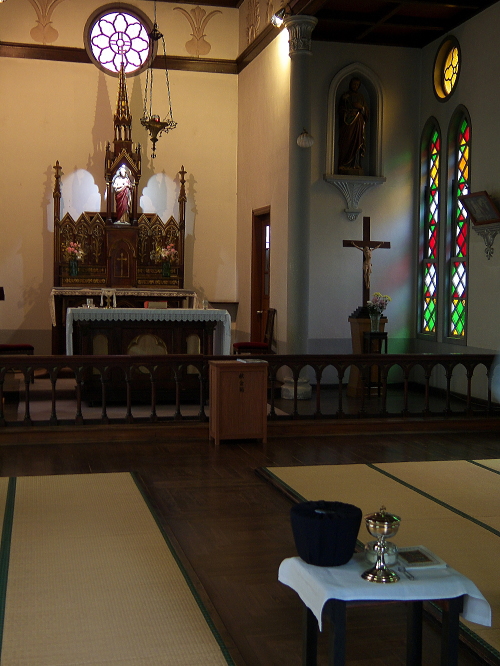 | 津和野・殿町通りにある石造りのゴシック様式教会で、内部は畳敷きになっており、昭和6年にドイツ人ヴェケレーにより建立された教会です。小さな教会ですがステンドグラスが美しく、雰囲気は立派なものです。隣接して乙女峠展示室があります。 |