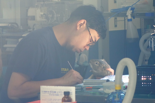 | 獣医に治療されている動物。 |