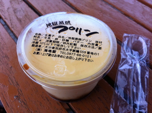 | 温泉の熱気を利用して作られた地獄蒸焼プリン。250円。 |