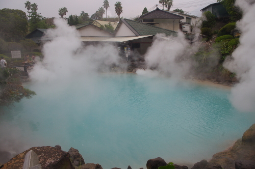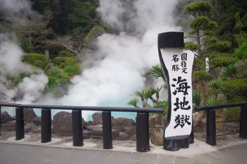 | 別府の鉄輪温泉街にある海地獄は、約1300年前に鶴見岳の爆発によりできた熱湯の池で、水温は98度・コバルトブルーの色をした別府地獄でも最大の池です。コバルトブルーは温泉中の成分である硫酸鉄が溶解しているためで、このコバルトブルーの色から海地獄と名付けられたそうです。また、国指定の名勝にも指定され、温泉では全国初の指定だそうです。 |