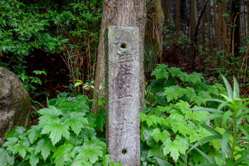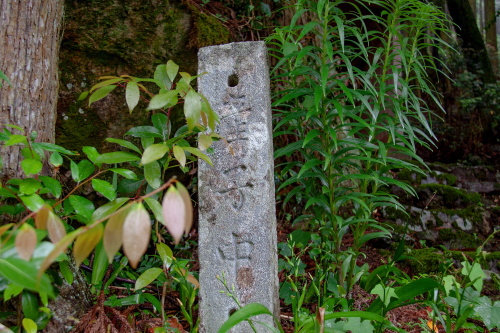 | 厳島神社鳥居下にある「産子中」と彫られた石碑。 |