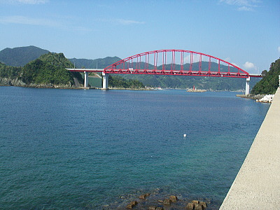| 脇岬地区と樺島を結ぶ樺島大橋。釣り客が多いです。 |