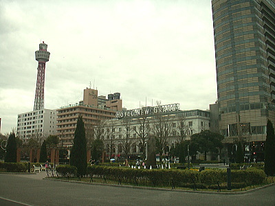 | 山下公園通りにあるホテルニュー・グランドと横浜マリンタワー。 |