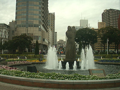 | 山下公園中央にある水の守護神像。奥に中華街の「朝陽門」が見えます。 |