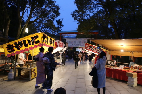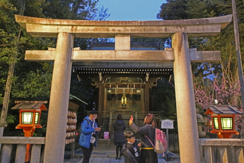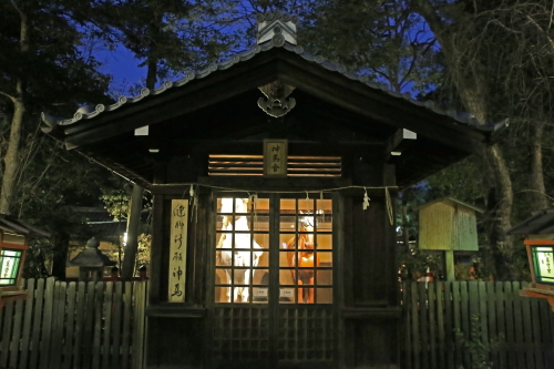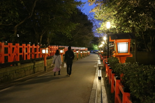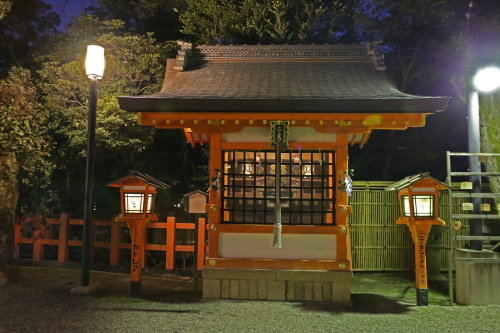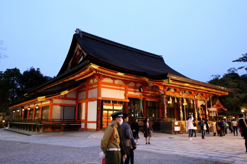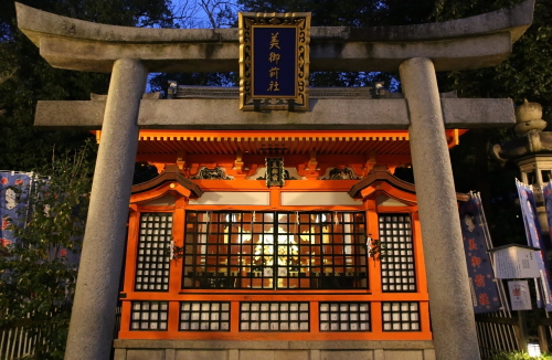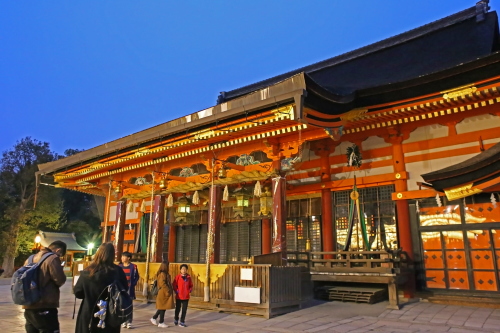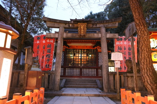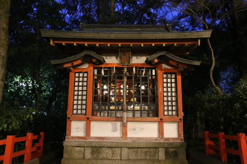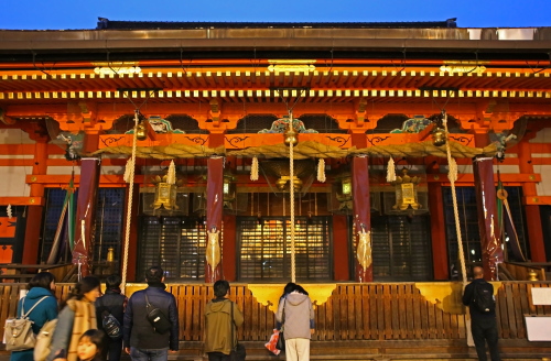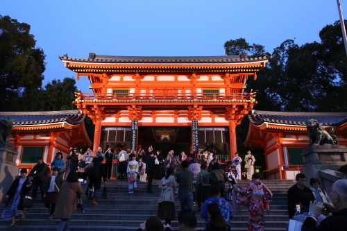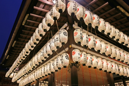 | 全国に三千社以上ある祇園神社の総本社であり、日本三大祭である祇園祭の神社である八坂神社は、夜間になるとそれぞれの社が照明で照らされ幻想的な雰囲気になります。八坂神社の御祭神は、素戔嗚尊・櫛稲田姫命・八柱御子神です。創建は656年と長い歴史があり、御本殿や楼門等は重要文化財に登録されています。 |