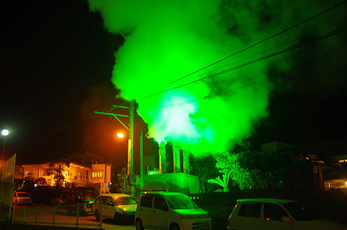 | 緑のライトアップされた湯煙。 |