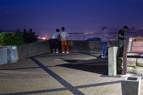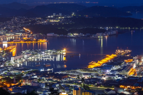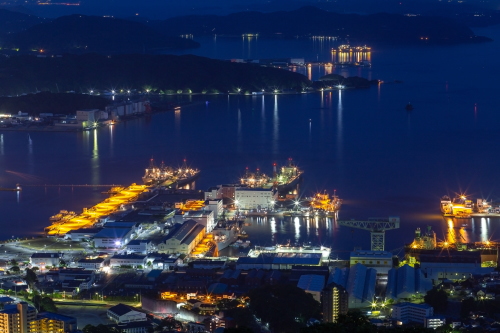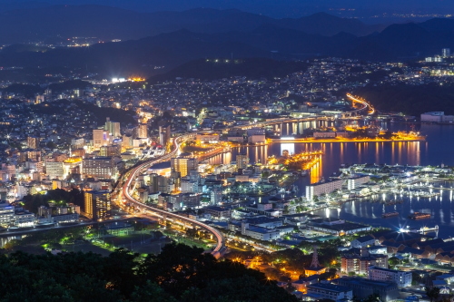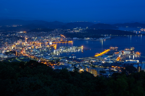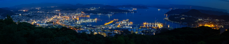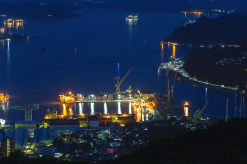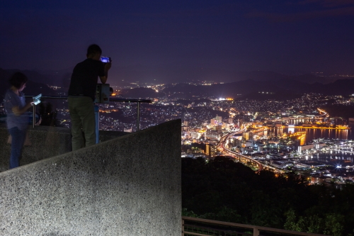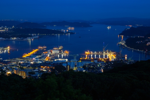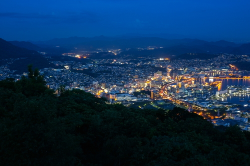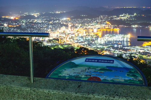 | 佐世保市のシンボル的な山である弓張岳からは、軍港の街・佐世保市の夜景を一望できます。佐世保市の夜景は、商業地などの白色と港湾施設のオレンジ色と非常に美しい夜景です。長崎市同様、平地が少ない佐世保市は山の斜面に住宅地が広がり、起伏が激しい独特の夜景です。また展望台を取り囲むように遊歩道があり良い雰囲気を出しています。 |