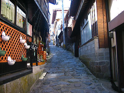 | 石畳の道を上から見た町並み。 |