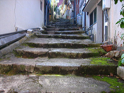 | ちょっと路地裏に入ると石で出来た急な階段があり、湯平が山中の谷にある温泉地であることがわかります。 |