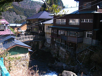 | 花合野川沿いから見た温泉旅館街。 |
