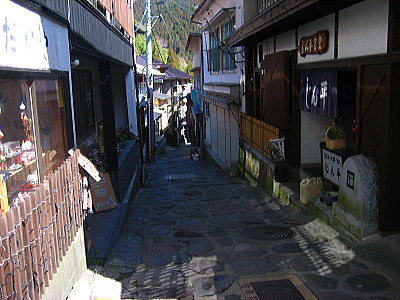 | 温泉で有名な湯布院の南の山の中に湯平温泉があります。狭い路地に数十件の宿がひしめき合うように立ち並び、石畳の上り坂が昔懐かしい景観をひきたてています。 |
