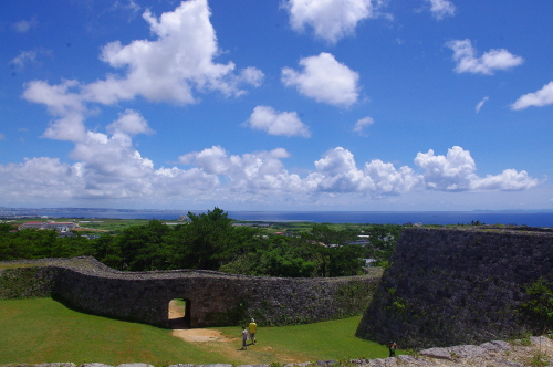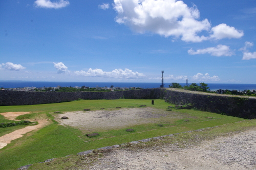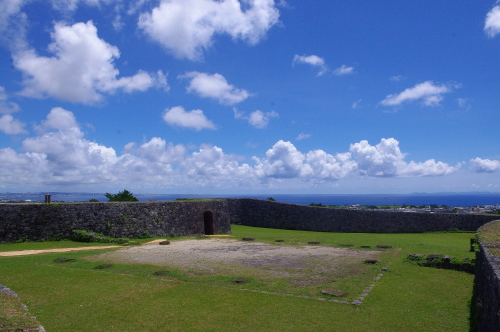 | 読谷村にある座喜味城跡は、護佐丸により1416年〜1422年に築城された座喜味城の跡で、戦前は日本軍の砲台や戦後に米軍のレーダー基地が置かれた経緯があり、日本に返還後国の史跡に指定され、現在は首里城とともに世界遺産に指定されています。現在では石垣のみが残っており、建築物に関しては資料が残ってなく、どういう城があったのかは不明だそうです。 |